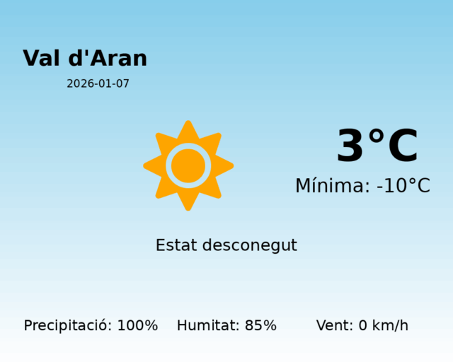 Avui, la Val d’Aran experimentarà un dia típicament hivernal, amb temperatures força baixes. La temperatura màxima s’espera que arribi als 3 °C, mentre que la temperatura mínima podria caure fins als -10 °C. Això significa que els habitants d’aquesta preciosa vall han de preparar-se per un fred intens, especialment durant la nit i les primeres hores del matí.