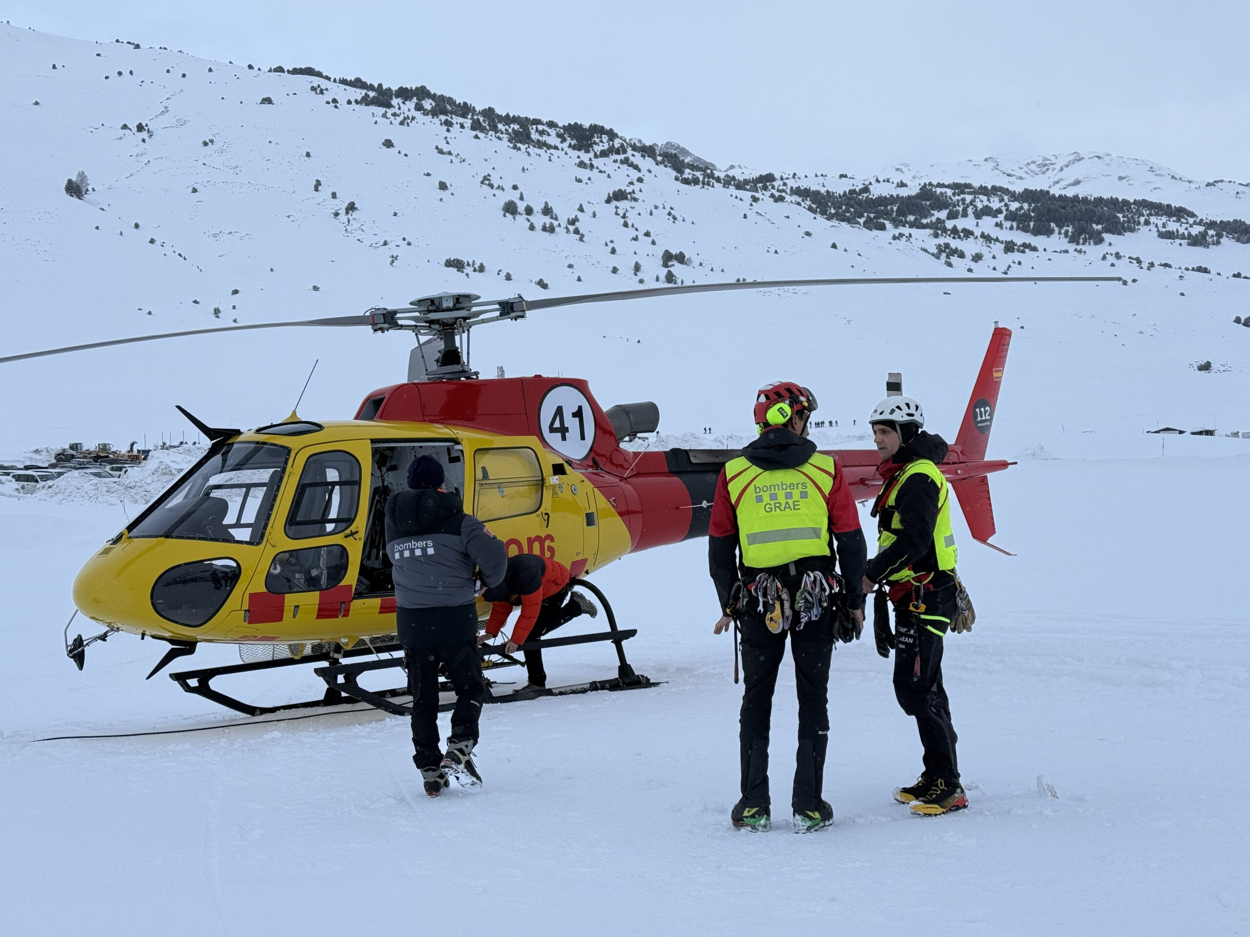Pompièrs d’Aran, Mossos d’Esquadra i bombers d’Aragó amb gossos, continuen treballant a la zona per descartar que no hi hagi cap persona atrapada sota l’allau donat que hi havia marques recents de traces d’esquí.