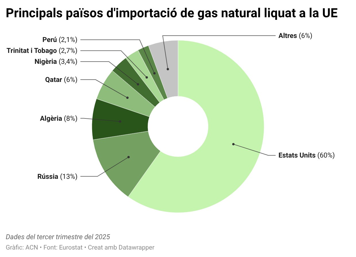 Les dues potències també són les proveïdores principals de la Unió Europea pel que fa a GNL: els Estats Units s’enduen un 60% del mercat comunitari –amb dades del tercer trimestre del 2025–, mentre que el règim de Vladímir Putin es queda en el 13%. Algèria és la tercera, amb un 8%, una xifra clavada a la d’Espanya, que també es nodreix de Nigèria (11%) i d’Angola (8%). Entre els països immersos en el conflicte obert a l’Orient Mitjà, el Qatar és l’únic amb un nivell de negoci destacable, ja que és d’on surten el 6% de les importacions de GNL europees i el 2,6% espanyoles.