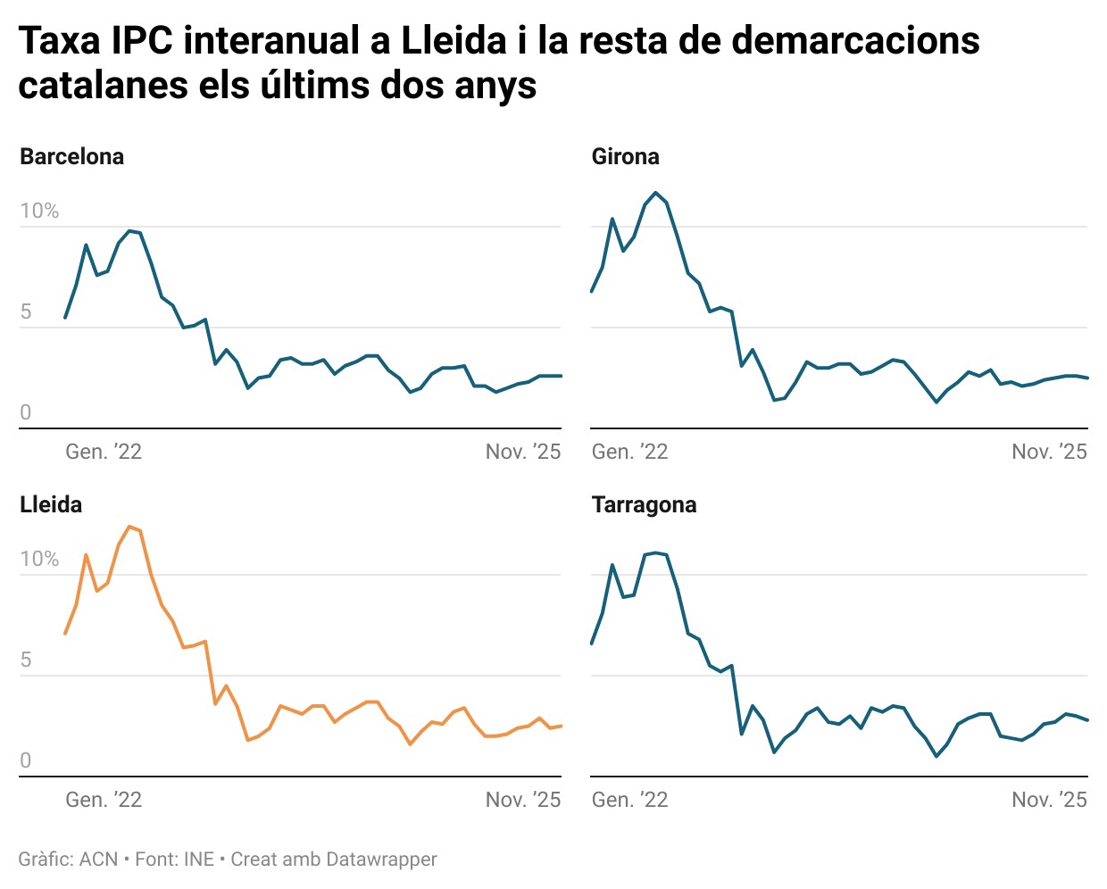 ACN Lleida – La variació anual de l’IPC a les comarques de Ponent i l’Alt Pirineu i Aran ha pujat 0,3 dècimes i se situa en el 2,5%. Segons les dades publicades per l’Institut Nacional d’Estadística (INE), els preus que engloben habitatge, aigua, electricitat i altres combustibles són els que més s’han encarit en comparació de fa un any, fins a un 5,9%. En aquest grup destaca el preu de la llum i el gas, que s’han encarit un 7,5% i el dels subministraments d’aigua, amb un 9,1% s’ha mantingut igual. Per contra, els preus de la roba és un 0,7% més baix i el del calçat són un 0,5 % més cars que el mes passat. Pel que fa a l’indicador mensual, respecte a l’octubre els preus han pujat tres dècimes.