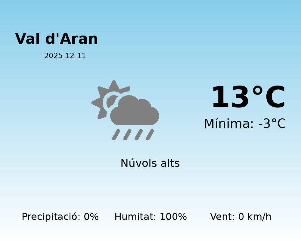 En resum, avui gaudirem d’un clima estable, sense sorpreses i amb temperatures típiques d’aquesta part de l’any. Aquesta és una bona oportunitat per aprofitar el dia sense les habituals inclemències hivernals que sovint afecten la nostra estimada Val d’Aran.